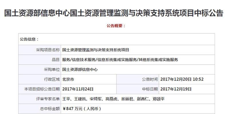 金拓维软件:成功中标国土资源部“国土资源管理监测与决策支持系统项目”