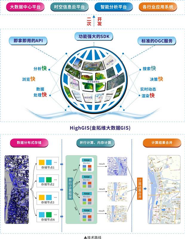 当今现实世界中已超过85%的数据与地理位置有关,这就意味着大数据GIS潜力无限、大有可为。而我们的HighGIS(金拓维大数据GIS)采用并行计算、内存计算、多级缓存、动态调度等技术,实现GIS算法的并行化计算,正好能满足云环境下超大规模空间地理信息数据的快速入云发布、浏览、查询、分析需求。基于HighGIS,我们金拓维已经形成了全系列的、成熟的产品体系,可广泛应用于数字城市、智慧城市及各行业应用系统建设。