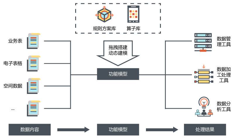 地理信息数据处理子系统能实现自定义规则、流程化搭建的方式对地理信息矢量空间数据、属性数据、地名地址数据的快速处理和数据核查等功能。