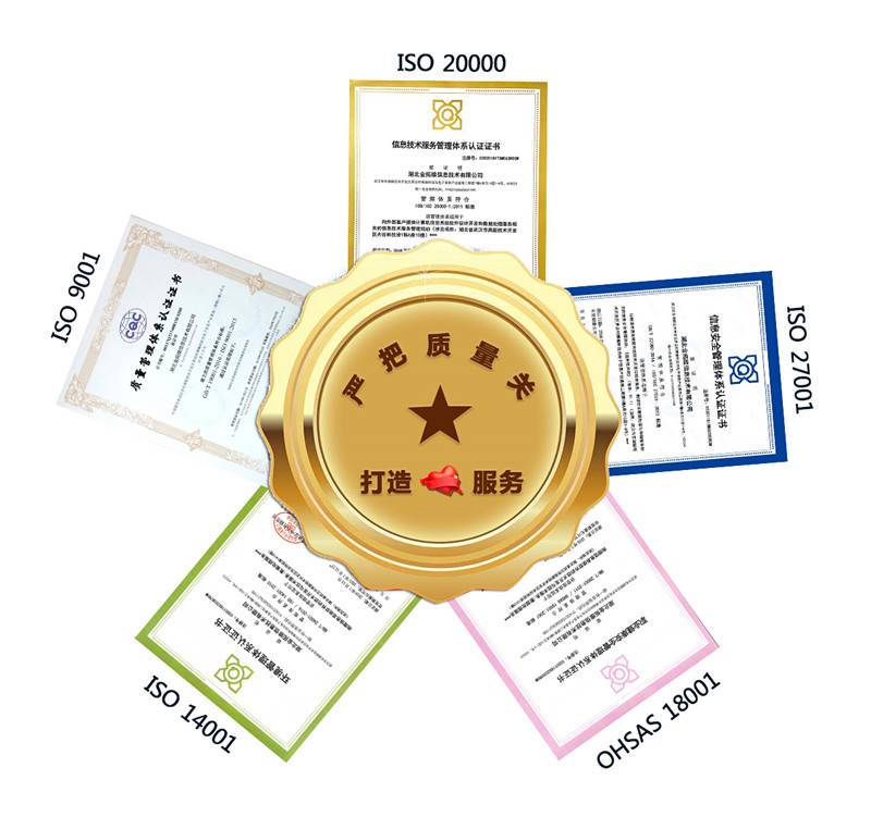 在经过权威认证机构重重严格审查后,金拓维软件凭借自身领先的核心技术优势、严格规范的质量管理流程、深入人心的“工匠”精神,以及全体员工精益求精的工作态度,一举顺利通过ISO9001(升级到2015版最新标准)、ISO20000、ISO27001、ISO14001、OSHAS18001五大权威的国际体系认证。