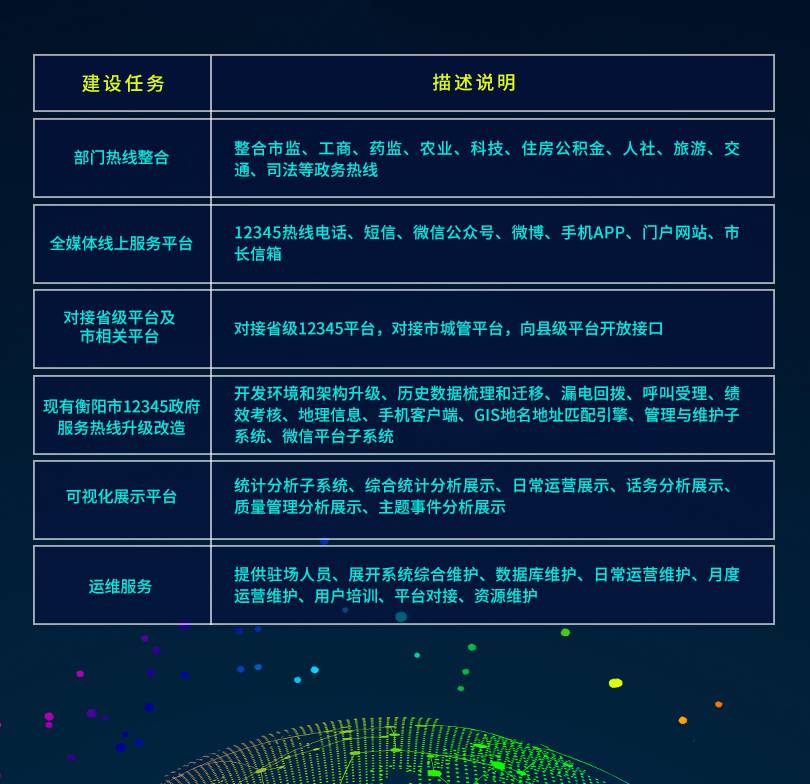 此次,衡阳市“互联网+政务服务”一体化平台建设项目共有6个包,由金拓维软件承建第五包、第六包,建设内容分别为衡阳市“12345”诉求服务平台、地理空间库配套软件体系。