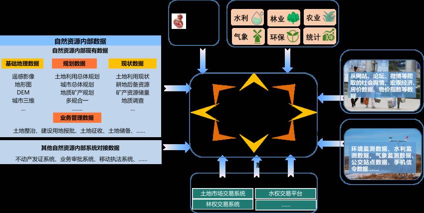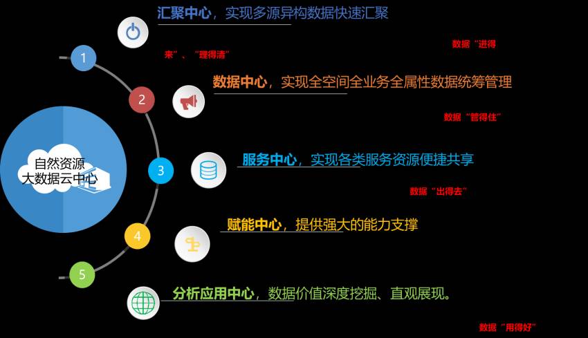 上述问题的存在,不仅固化现有部门、系统间的信息壁垒,降低政府的办事效率,更让数据资源的价值得不到体现。基于此,应统筹构建统一的自然资源大数据中心,解决海量数据进得来、理得清、管的住、用的好、出得去的核心问题。