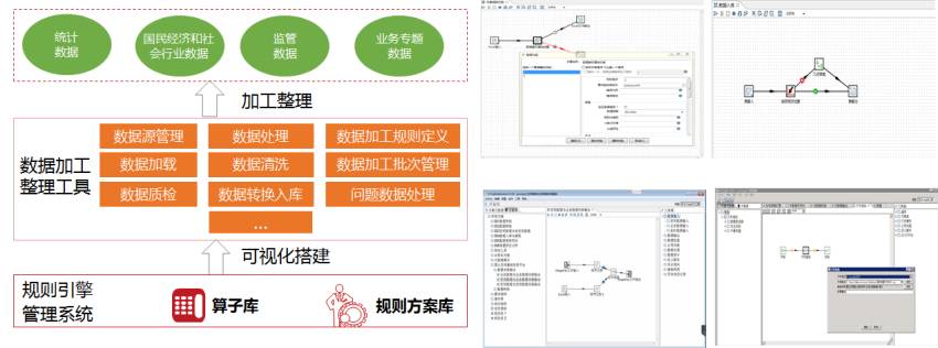 自然资源大数据体系内容丰富、规模庞大、形态多样,数据加工治理需求纷繁复杂,加工治理工作任务重、时间紧。采用规则引擎流程搭建技术,在可视化界面通过拖拽自定义规则方案,零代码开发或少量编码即可快速搭建各类数据加工整理工具,按照“工具为主,人工为辅”的思路,对自然资源数据进行加工处理。同时基于并行计算技术,提供并行化数据处理工具,提高数据加工处理效率,实现高效能的数据治理。