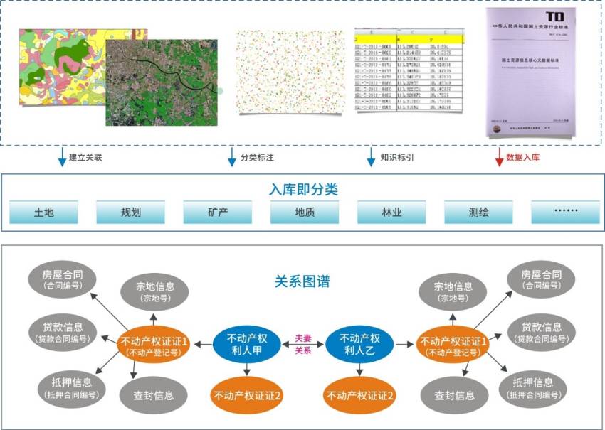 通过数据标引、关系图谱构建实现数据入库即分类、入库即关联,同时引入元数据管理,以元数据为驱动,建立多源异构数据间的关联关系,打破数据壁垒,释放数据价值,为数据分析挖掘提供基础。