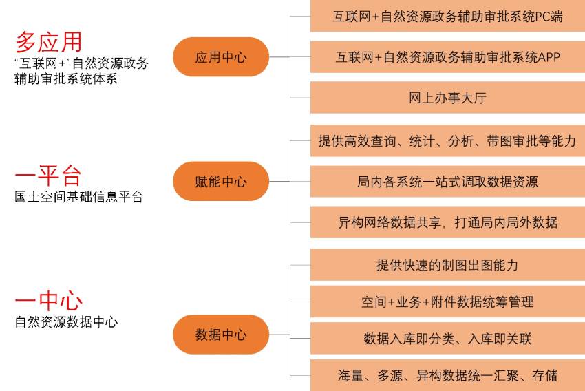 按照“一中心、一平台、多应用”的“1+1+N”体系构建,打造一个数据中心、一个赋能中心和一个应用中心,统筹设计形成互联网+自然资源政务服务体系。