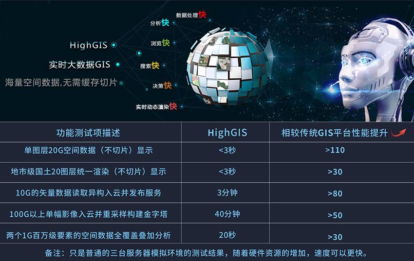 金拓维自主研发的HighGIS(大数据GIS)采用并行计算、内存计算、多级缓存、动态调度等技术,实现GIS算法的并行化计算,满足云环境下超大规模空间地理信息数据的快速入云发布、浏览、查询、分析需求。