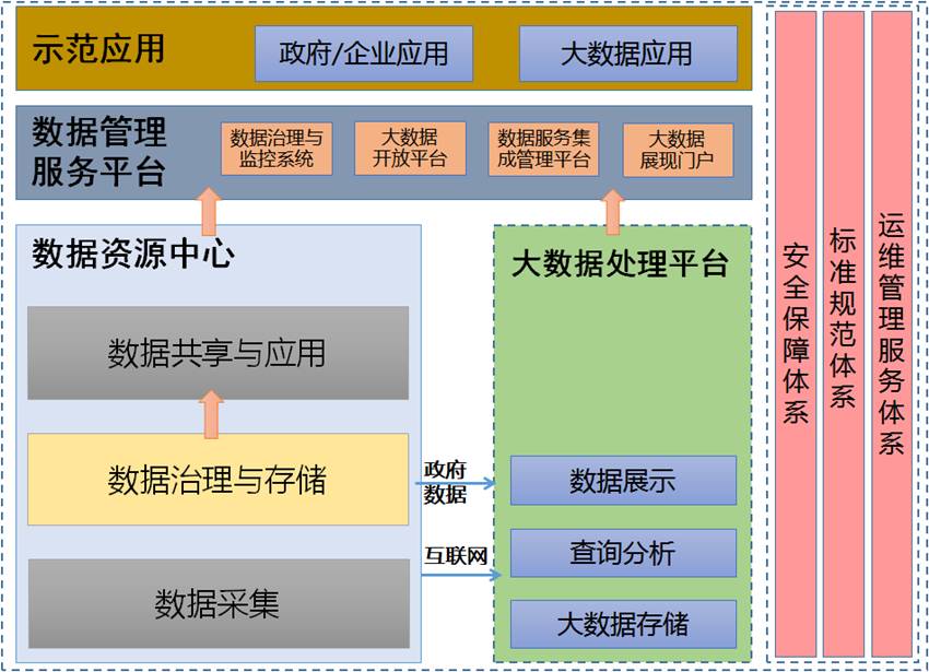 运维管理服务体系:建立以数据共建共享、互惠互利的运维管理服务体系,健全数据运行机制,强化管理责任,运用先进技术,确保政务大数据中心持续、稳定运行。
